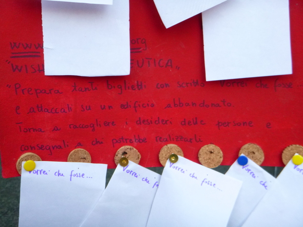 Prepara tanti biglietti con scritto “Vorrei che fosse ____” e attaccali su un edificio abbandonato. Torna a raccogliere i desideri delle persone e consegnali a chi potrebbe realizzarli.