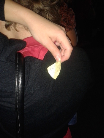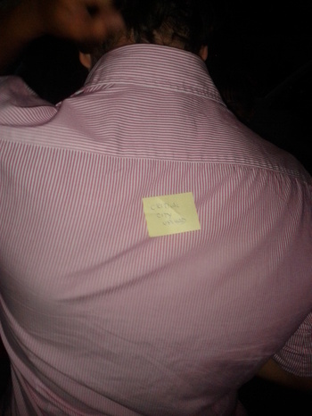 abbiamo quindi recuperato tramite conoscenti dei bellissimi post-it gialli fluo, e dopo averli marchiati con il "critical city upload", in modalità ninja li abbiamo appuntati sulle schiene della gente attorno a noi.