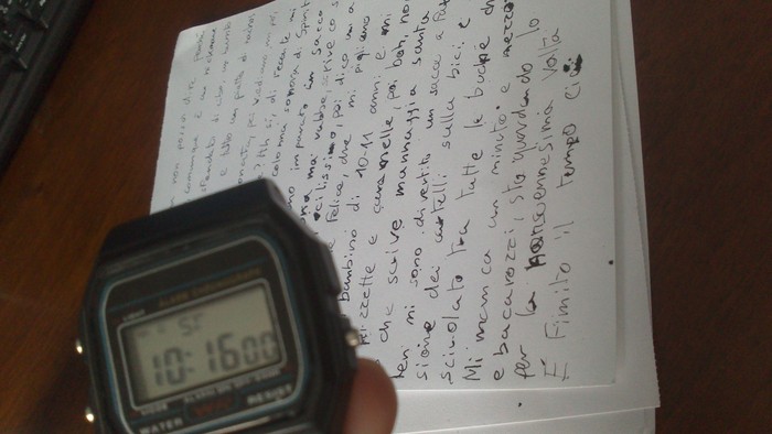 Mi chiamo Dimèck, ma non posso dire perchè perchè è un segreto, comunque è un nickname figo, allora, ieri mi sono sfondato di cibo, un burrito al chili grosso come Capri e tutto un piatto di nachos un sacco buoni, poi la limonata, poi vediamo un po', che altro posso raccontare? Ah sì, di recente mi sto chiudendo con la colonna sonora di Spirit e mi sono imparato un sacco di canzoni a memoria ma vabbe, scrive co sta penna è difficilissimo, poi dico una cosa che mi rende felice, che mi pigliano tutti per un bambino di 10-11 anni e mi regalano pizzette e caramelle, poi boh, non ce lo so che scrive mannaggia santa mannaggia. Ieri mi sono divertito un sacco a fare la missione dei cartelli sulla bici e so quasi scivolato tra tutte le buche che c'erano. Mi manca un minuto e mezzo, pulcini e bacarozzi, sto guardando "Io sono leggenda" per la nonsoennesima volta.