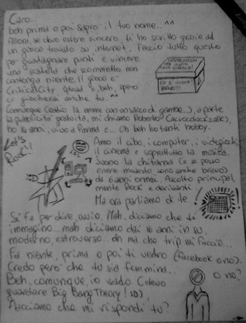 Scrivi a mano, in una lettera, qualcosa di semplice, arricchisci con disegnini od oggetti. Spedisci il tutto ad uno sconosciuto, in Italia o all'Estero.