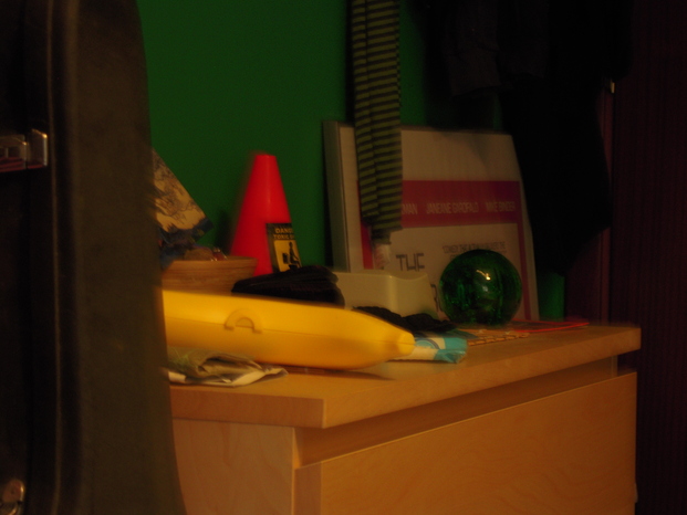 tra vari strumenti musicali, un violino che non ho mai imparato a suonare, due foto, una cassettiera, ricordi e un vecchio telefono, il mio sguardo cade sull'utilissimo portabanana giallo (credo contenga anche una banana in questo momento) come potrei mai farne a meno = )