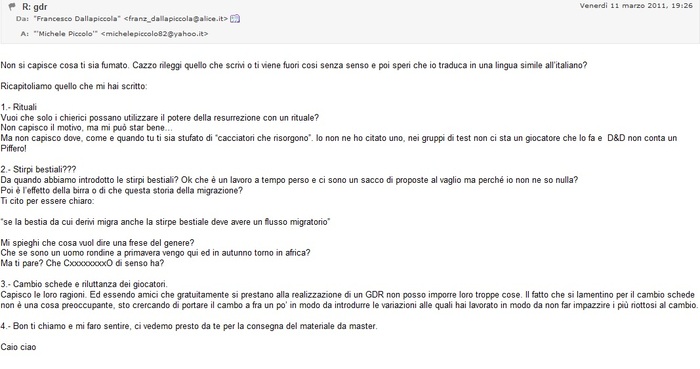 Volevo poi parlarti delle stirpi bestiali, che ne dici di mettere che se la bestia da cui derivi migra anche la stirpe bestiale deve avere un flusso migratorio.. sembra una stronzata forse lo è però mi pare anche figo... dovremo comunque vederci per creare una strategia attuativa di tutte le variazioni perche i playtester stanno menandosela male sul cambio schede.. io gli ho detto che sono dei playtester, ma gia non si vogliono fare riprendere , po non vogliono cambiamenti, caspita il gioco è nuovo non ti pare..