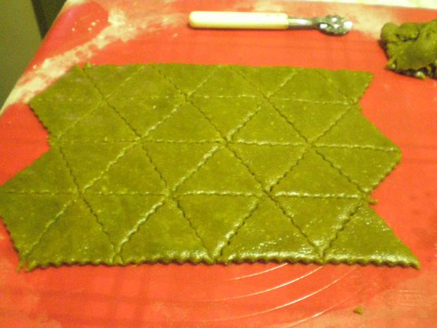 Senza fretta, con il pc sul tavolo (coperto con la pellicola trasparente :P ) con a schermo la ricetta (oltre a N altre cose ) con l'impasto che prima ricorda sempre più Jabba di guerre stellari ( O.o ) e poi, appiattito e tagliato (con la rotella datami dal Nonno <3 ) in tanti triangoli già assume un'altra faccia.