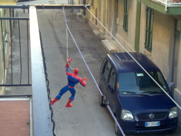 Ero lì che guardavo questo vecchio giocattolo dell'uomo ragno e ho pensato:"Una missione, ci sta." E da lì si è ritrovato appeso al filo del bucato ad ondeggiare come solo spiderman sa fare!